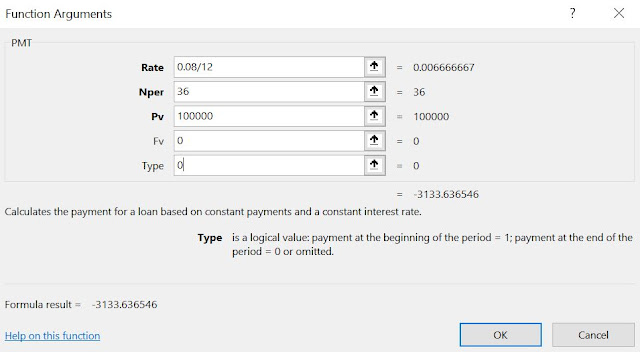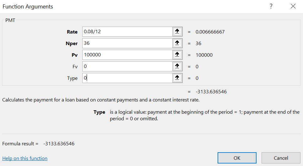3. In the next box, provide the details: Rate = 0.08/12, Nper = 36, Pv = 100000, Fv = 0, Type = 0