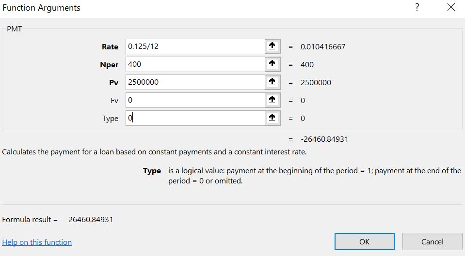 3. In the next box, provide the details: Rate = 0.125/12, Nper = 400, Pv = 2500000, Fv = 0, Type = 0